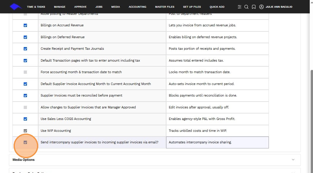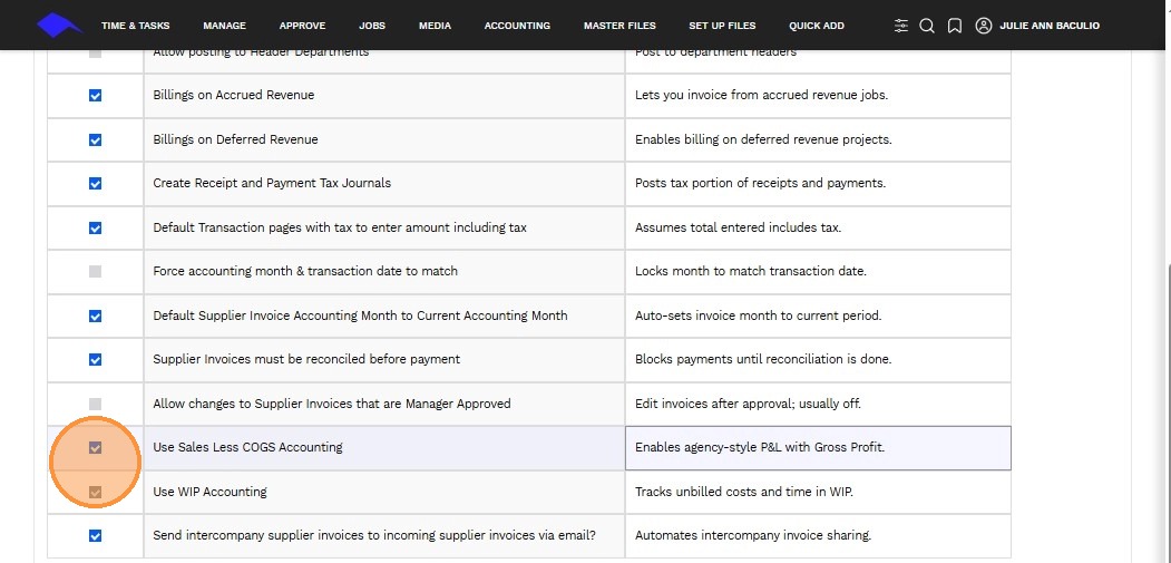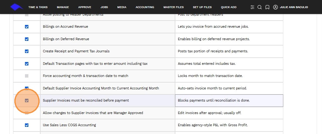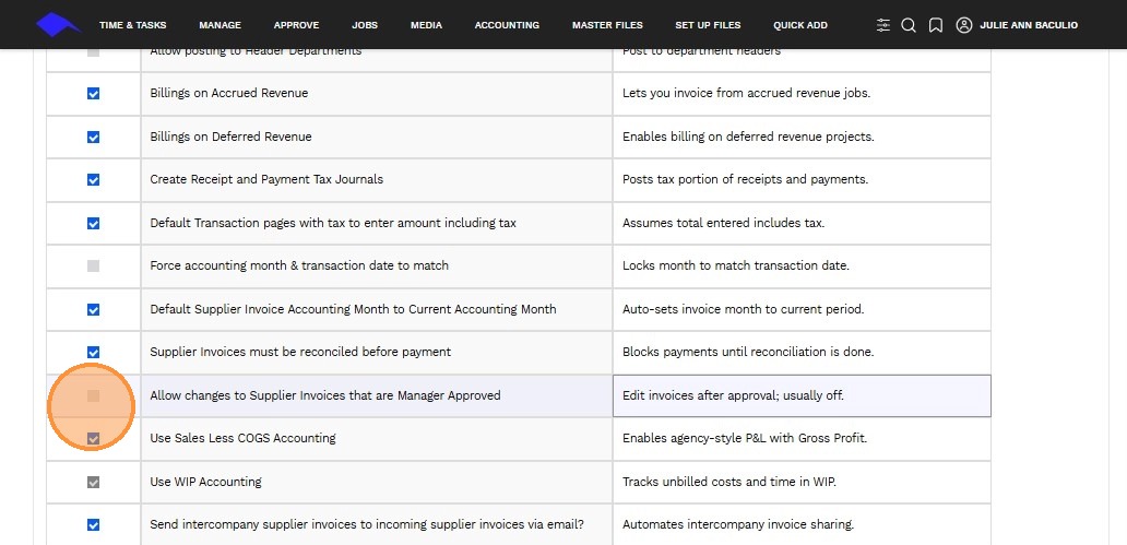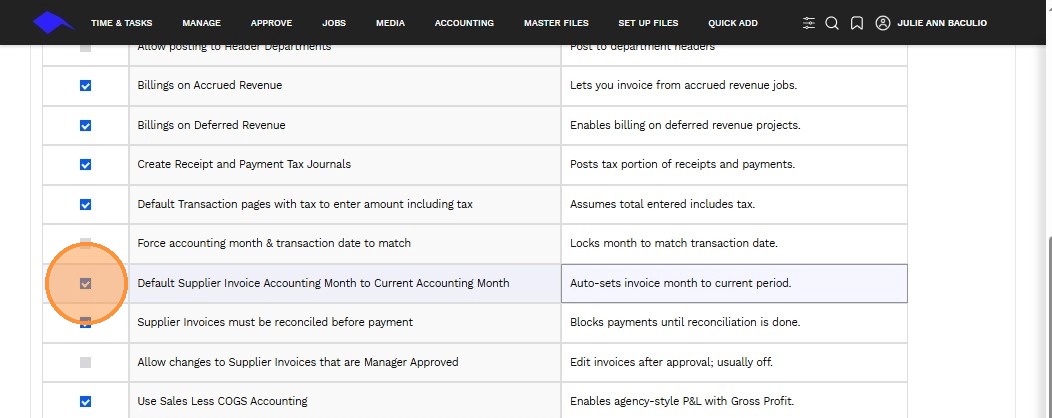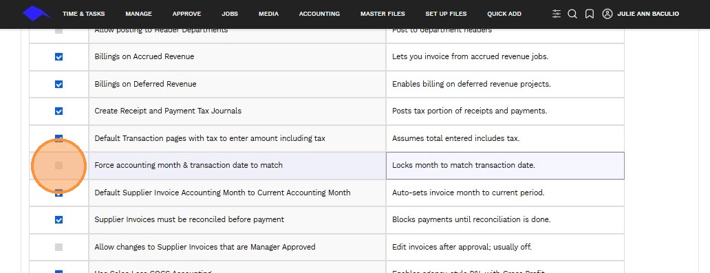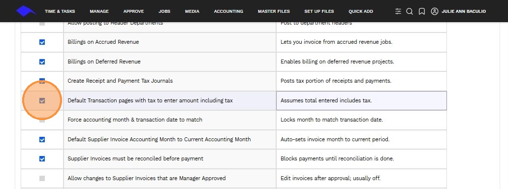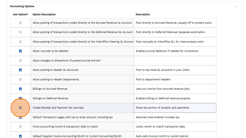 3. Use the checkbox to enable or disable a specific accounting transaction feature.