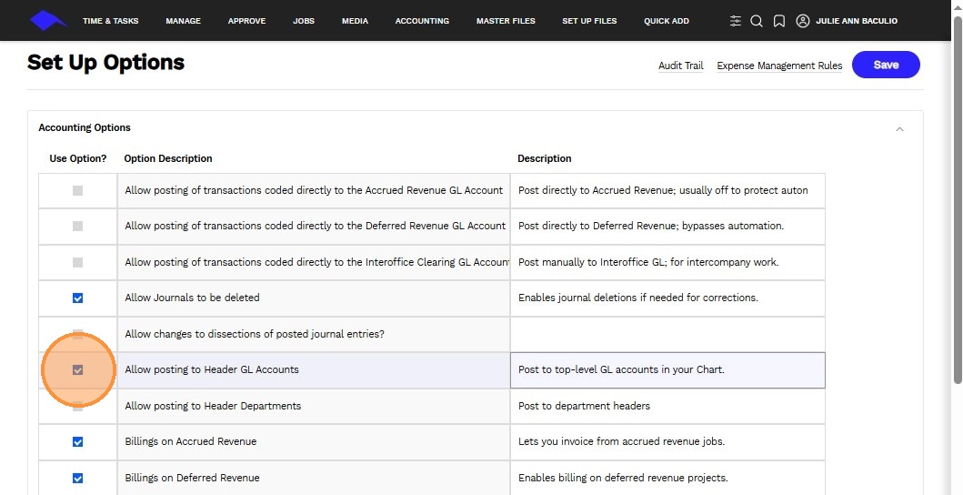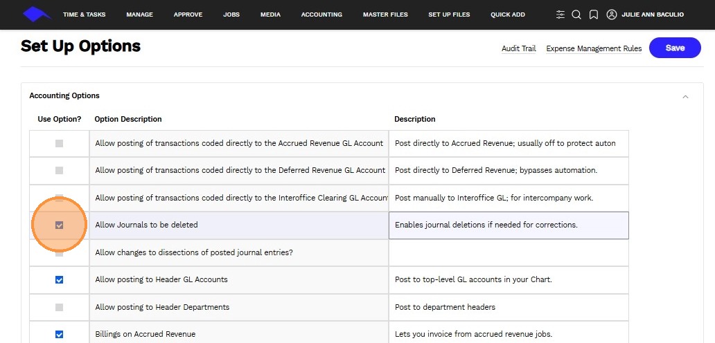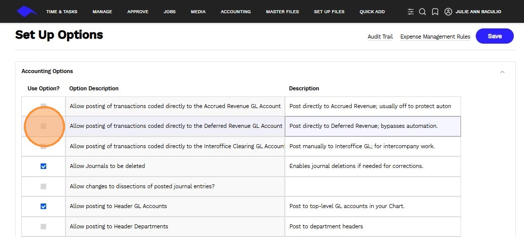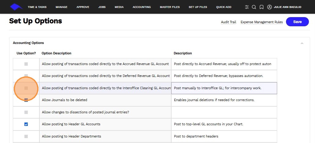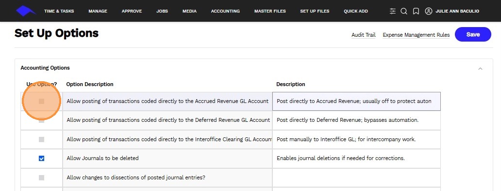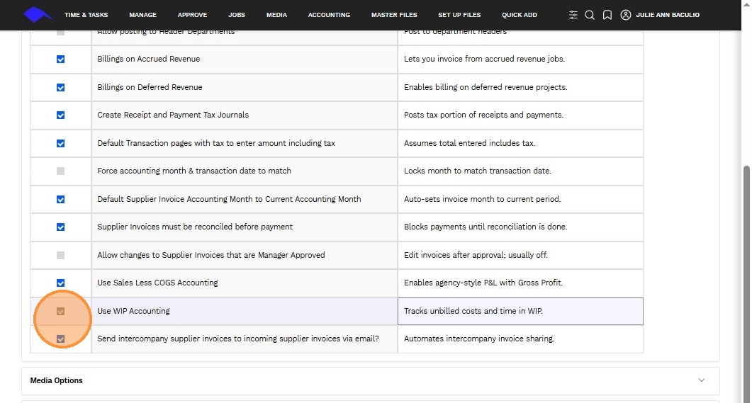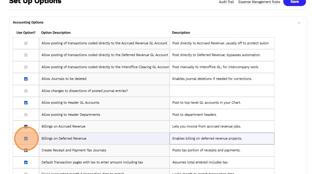 3. Use the checkbox to enable or disable a specific accounting transaction feature.
