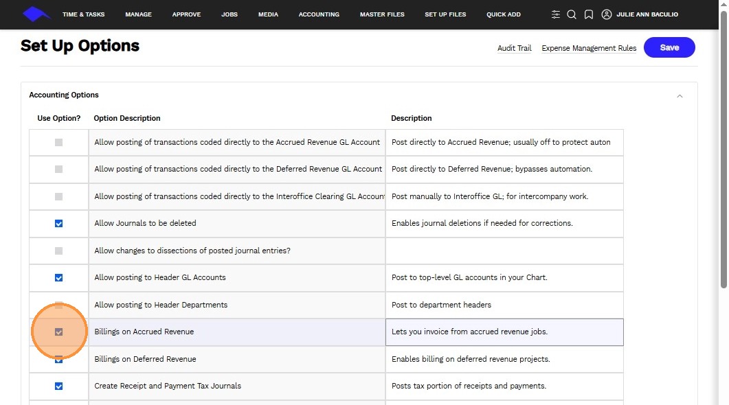 When checked, processing an Accrued Revenue entry will also generate a billing entry in the Billings account, capturing the billings associated with the accrued revenue.