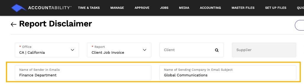 Use Report Disclaimers to set a standard Sender Name Company Name to display on emailed reports, including client invoices.