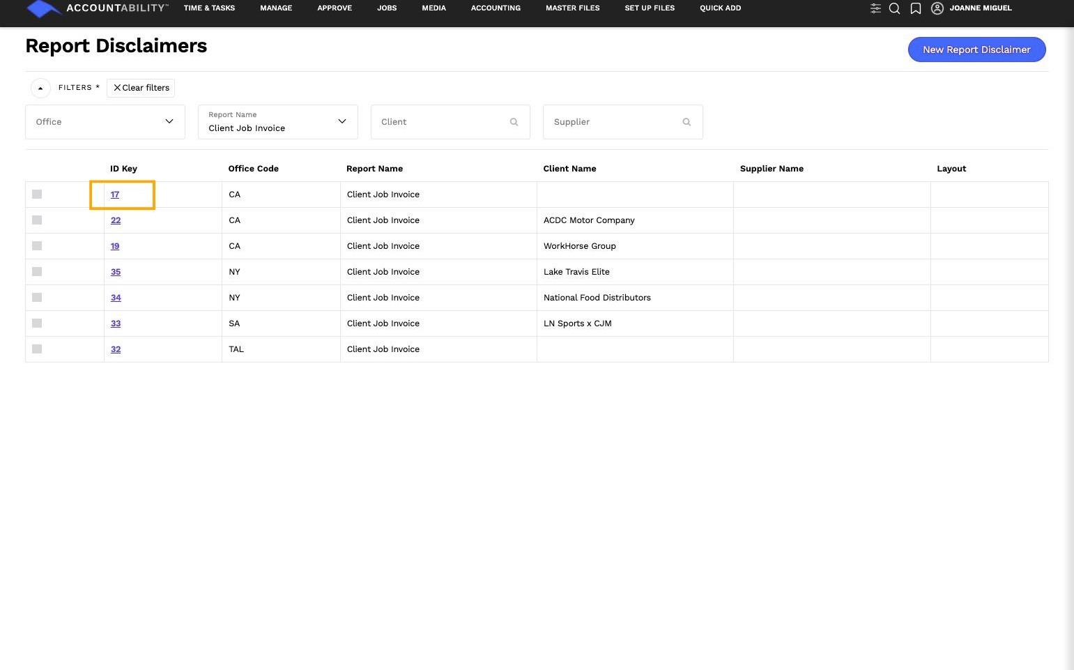 2. To update the sender details for client job invoices, filter on the Report Name of "Client Job Invoice". Click on the hyperlink for the disclaimer.