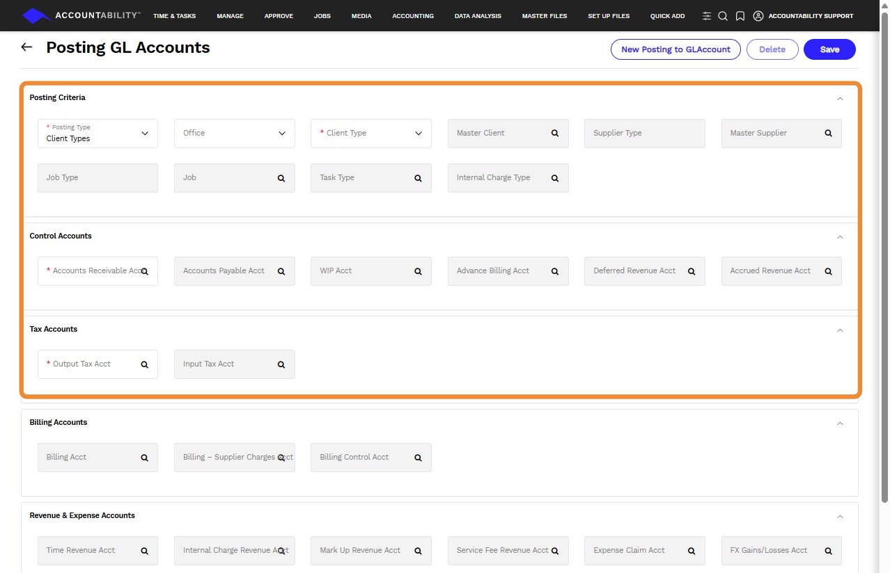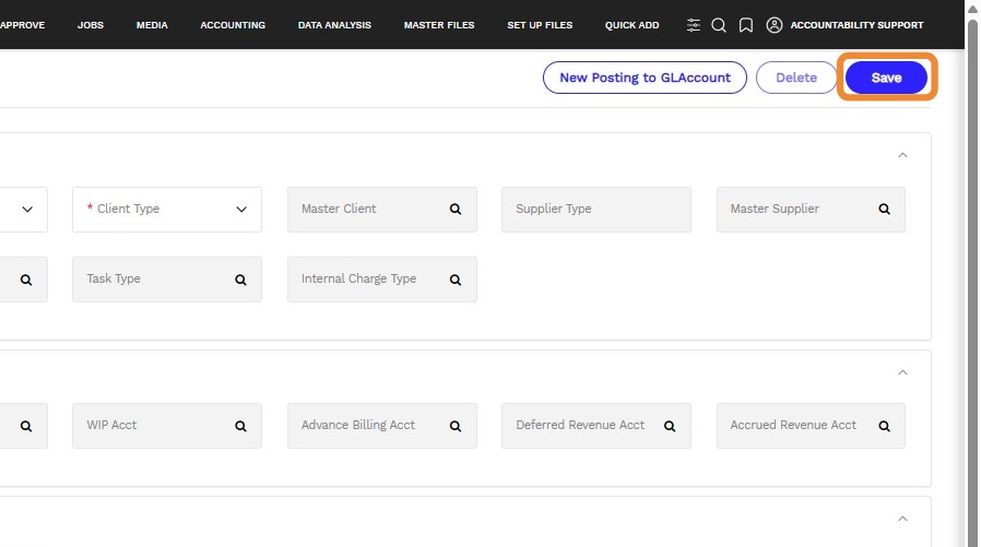 - Output Tax Acct - Tax on client invoices for the selected master client- For example, The tax amount for a client job invoice is credited to this account, where the invoiced client’s master client matches the selected master client.