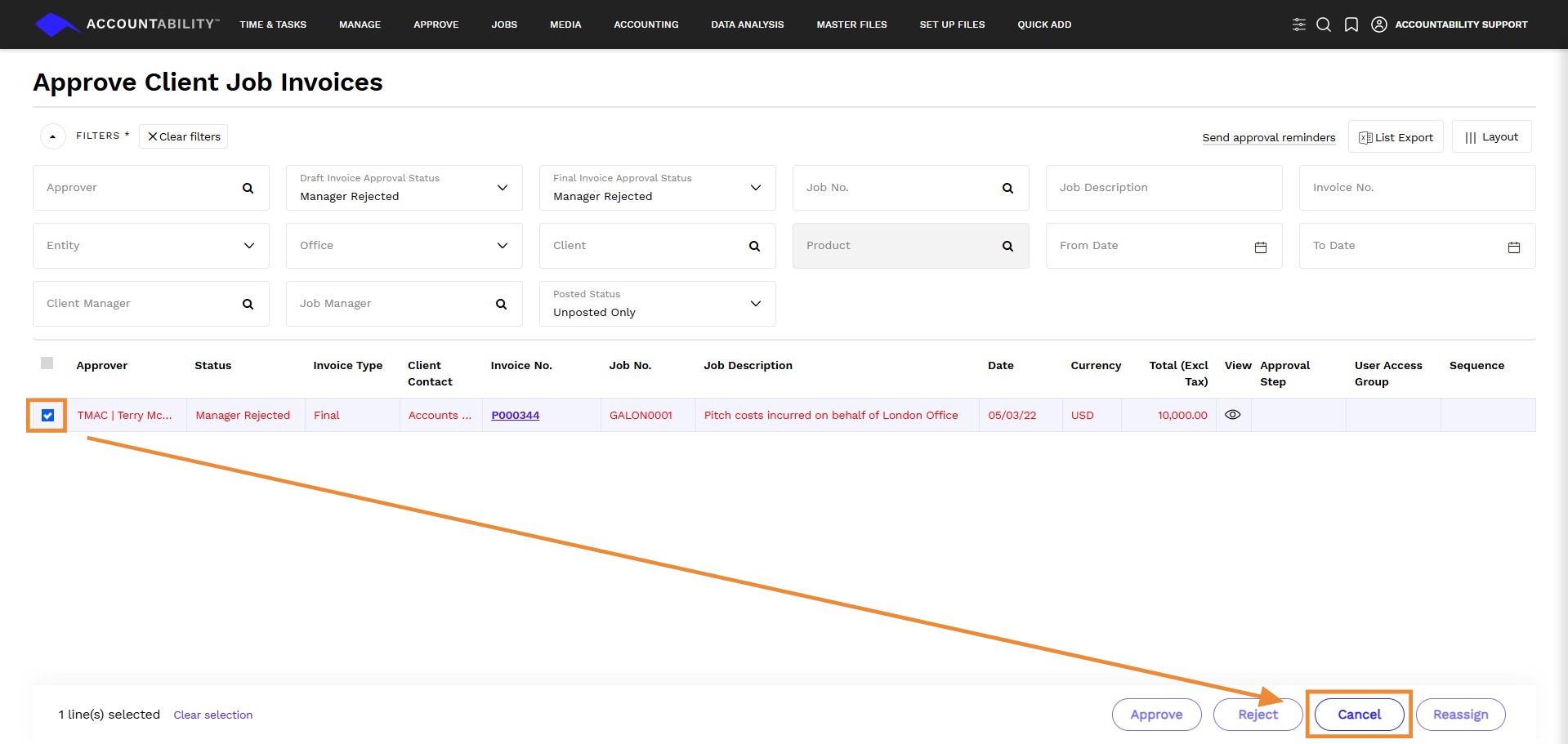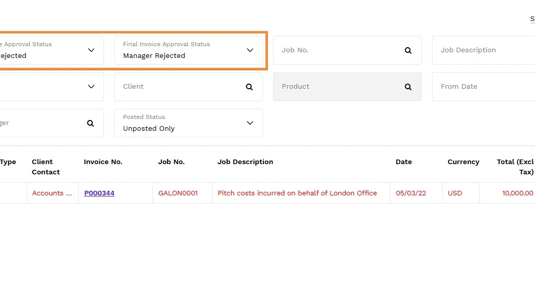 2. Go to the Draft Invoice Approval Status filter and Final Invoice Approval Status filters and change it to Manager Rejected.
