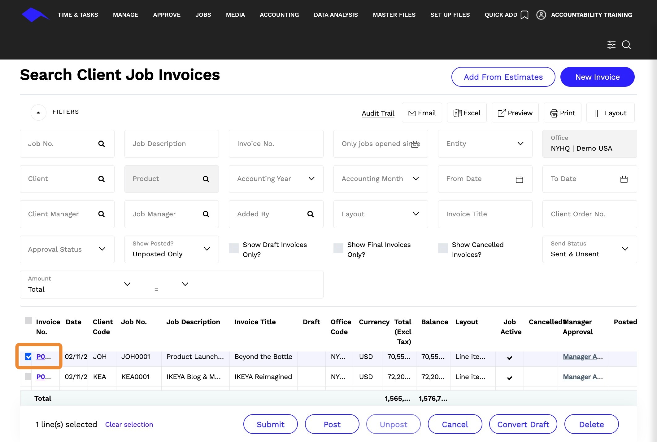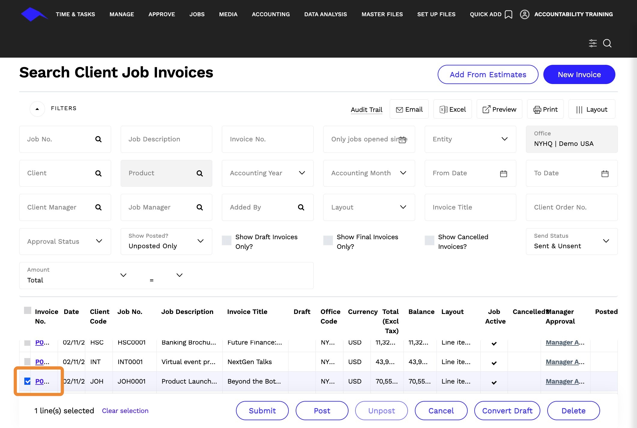 Navigate to ACCOUNTING >Receivables > Client Job Invoices.