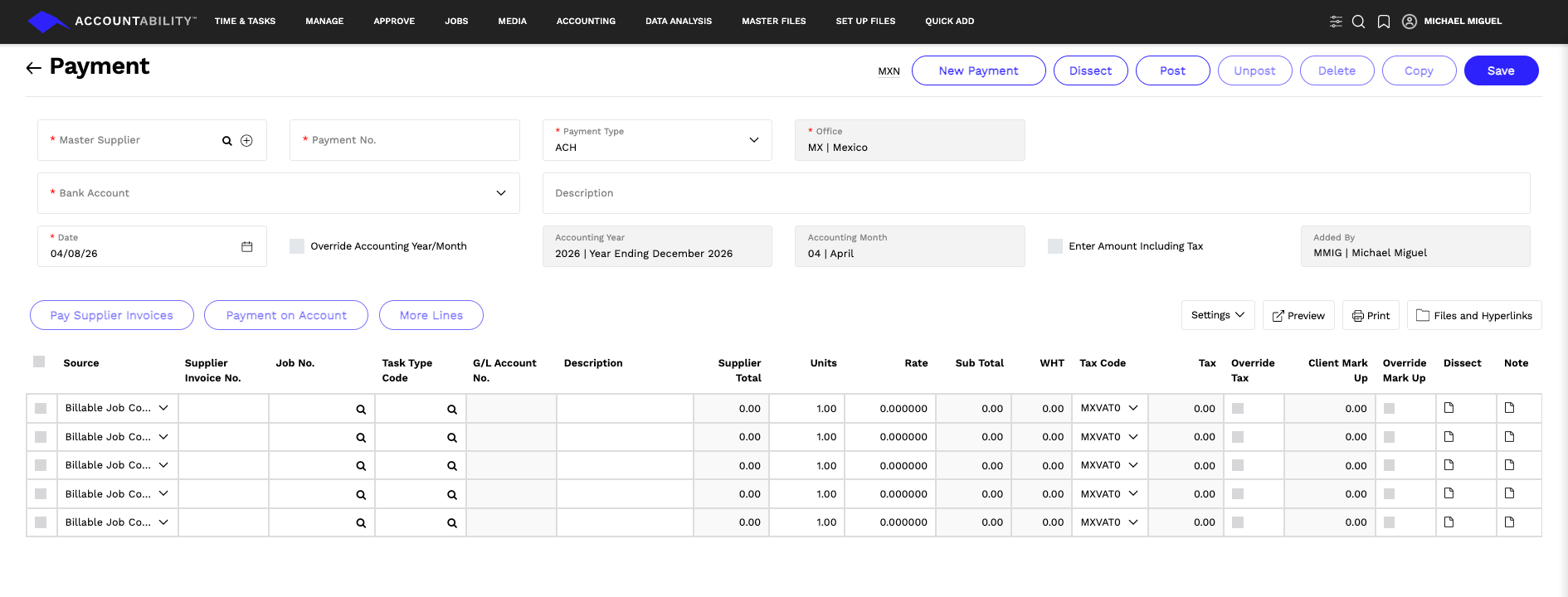 Payment Type Confirm or select a payment type. Office Confirm or select an office. Bank Account Confirm or select the bank account. Description Enter a description - optional. Date The payment date defaults to today's date. You can create a number of payments and override this function and assign them all to a specific date. Override Accounting Year/Month Check the box if you wish to change the accounting month/year and enter the desired accounting year and accounting month. Enter Amount Including Tax Check the box if you want to enter the amount to include taxes. Source Select a source. Job No. Enter or select a job number. Task Type Code Enter or select a task type code Units Enter the units. Rate Enter the rate. Tax Code Select a Tax code. - Click SAVE