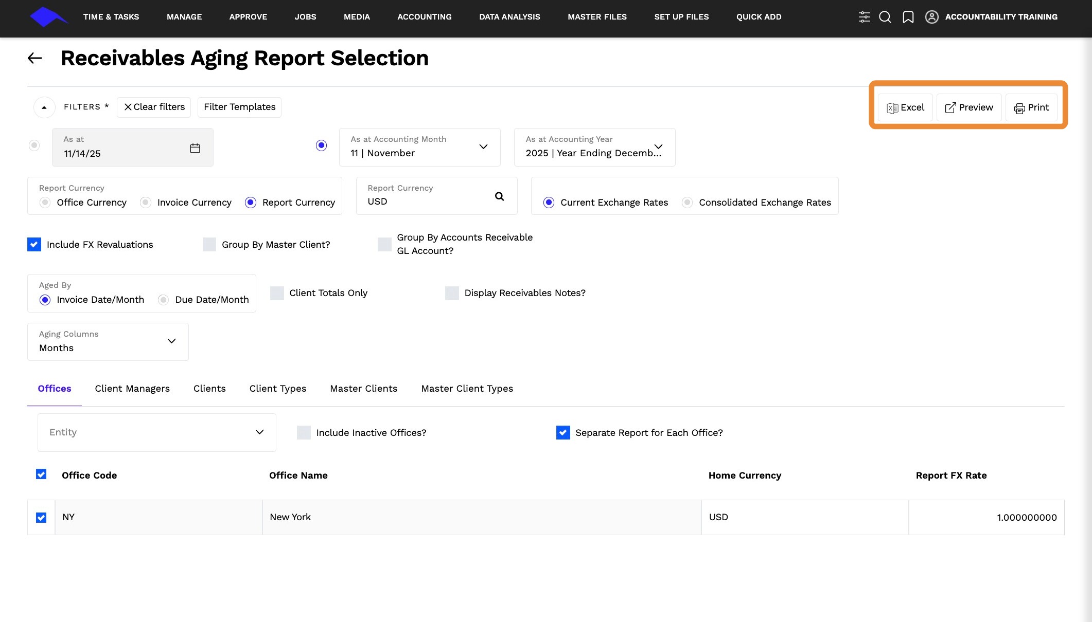 6. Click EXCEL, PREVIEW, or PRINT to view the report.