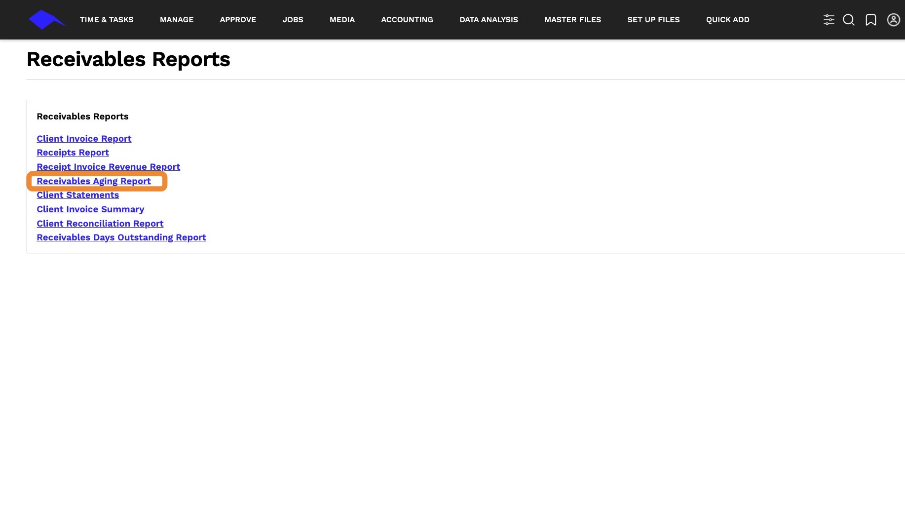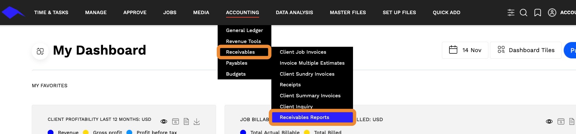 1. Navigate to ACCOUNTING > Receivables > Receivables Report.