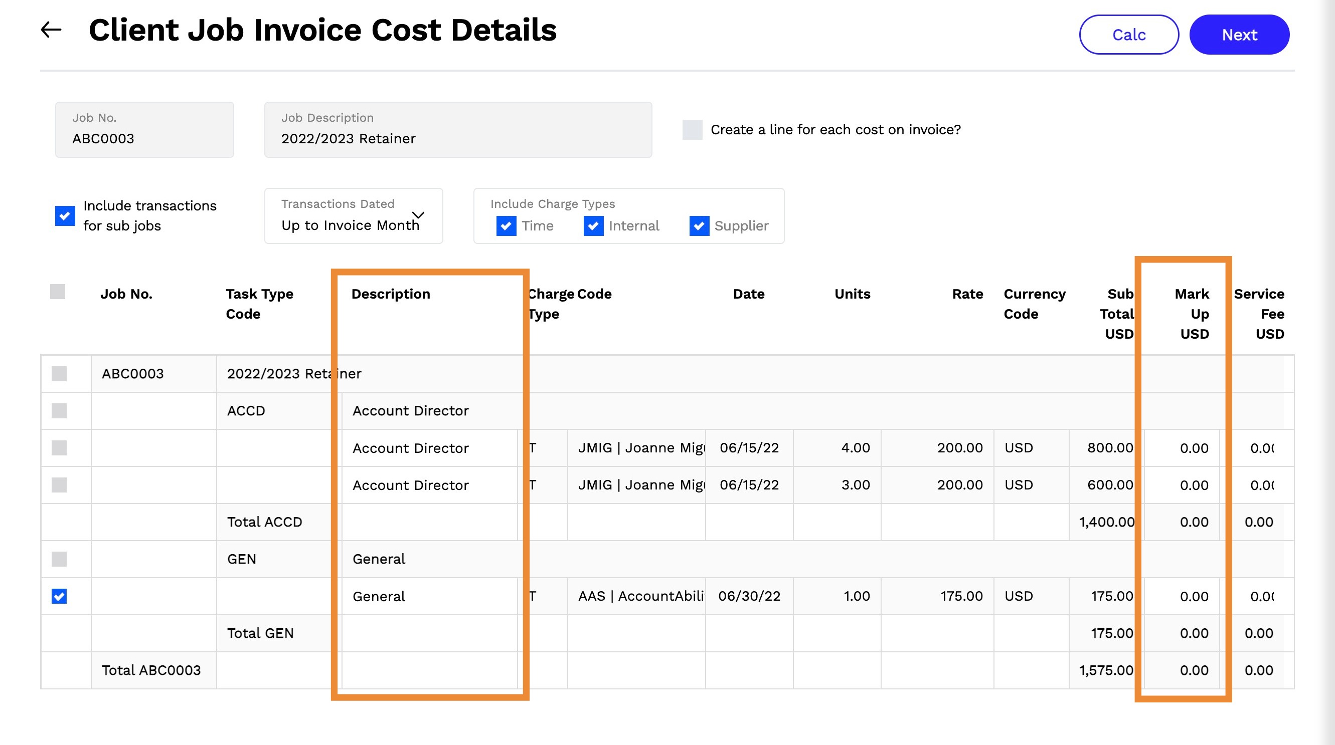 If necessary, you can adjust the Mark up amount or Description of the supplier cost to be included on the invoice.