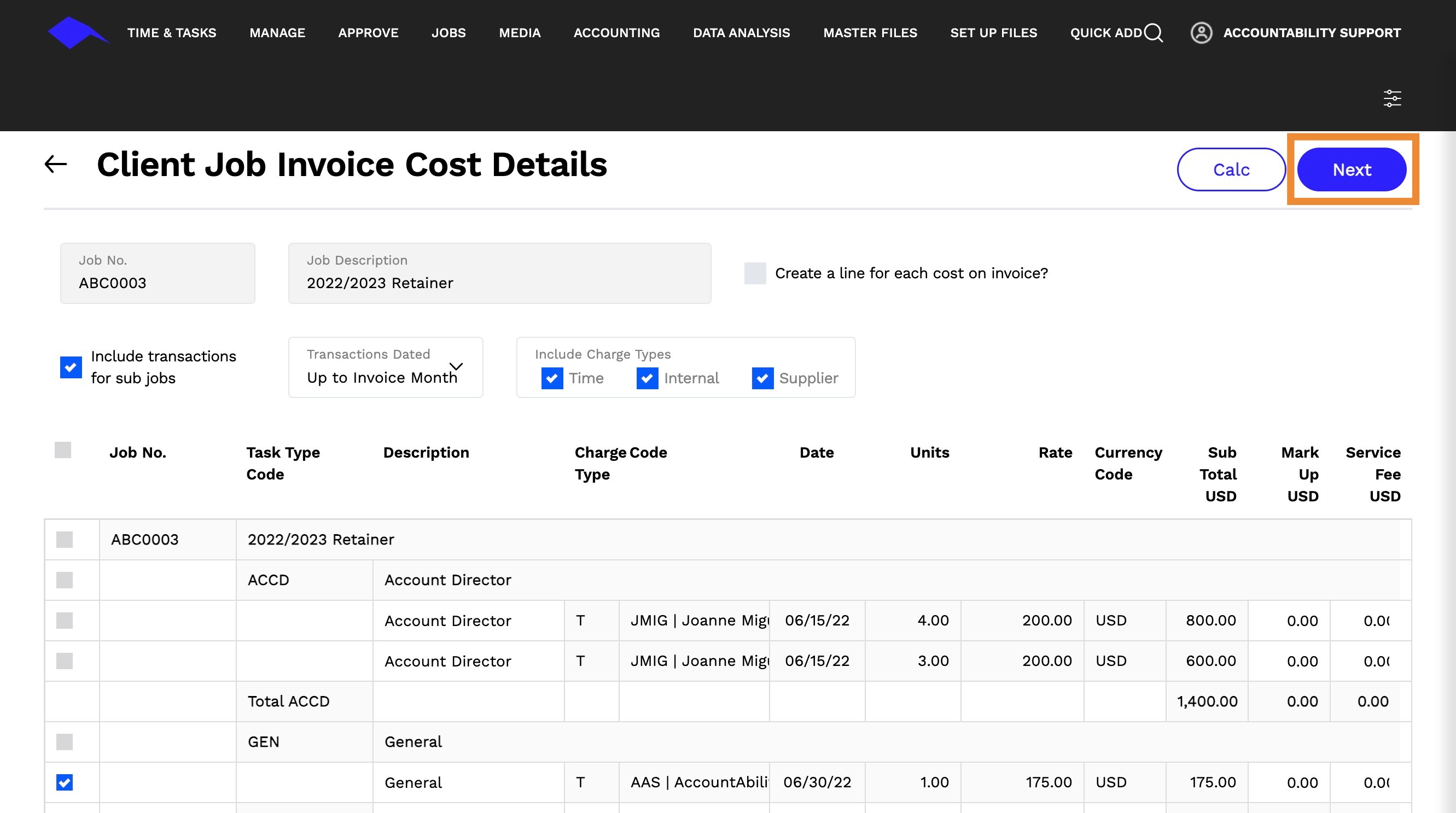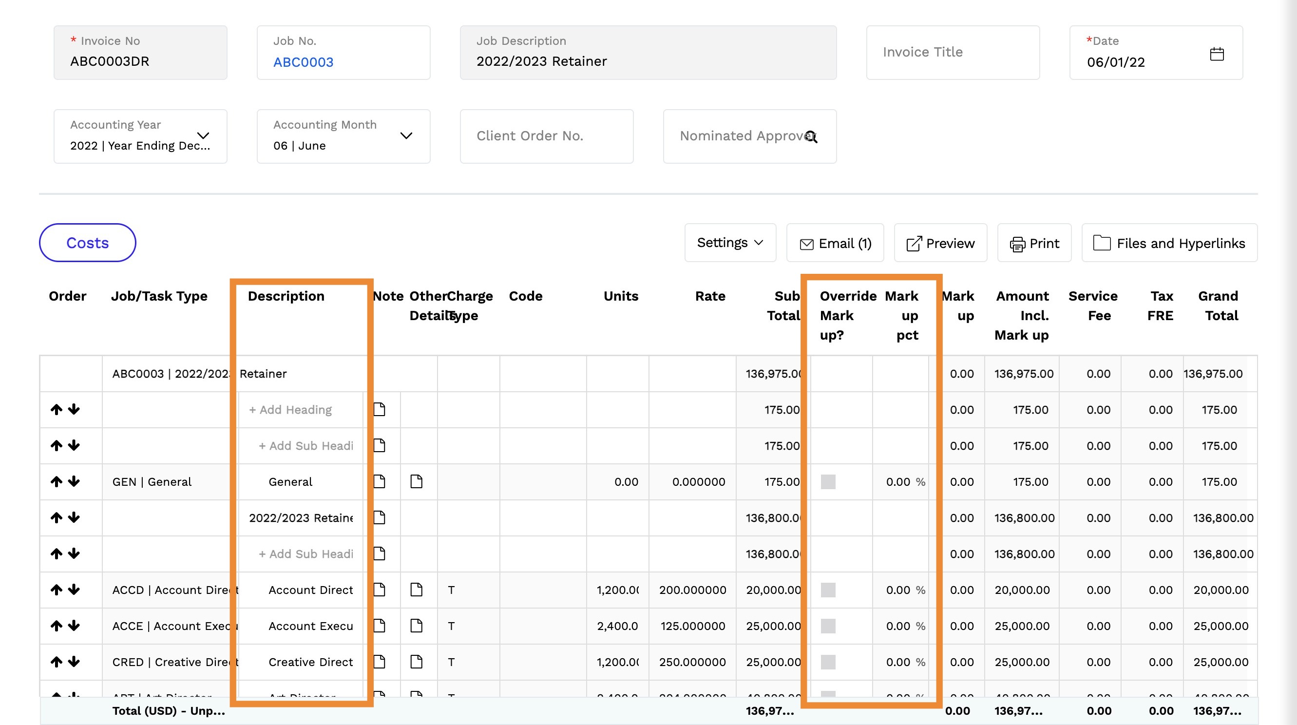12. To include both actual costs and scheduled estimated amounts on the invoice, you can choose to include or exclude billed supplier costs by selecting the Override Mark Up? option. You can then edit the Mark up and Description for the actual line items as needed.