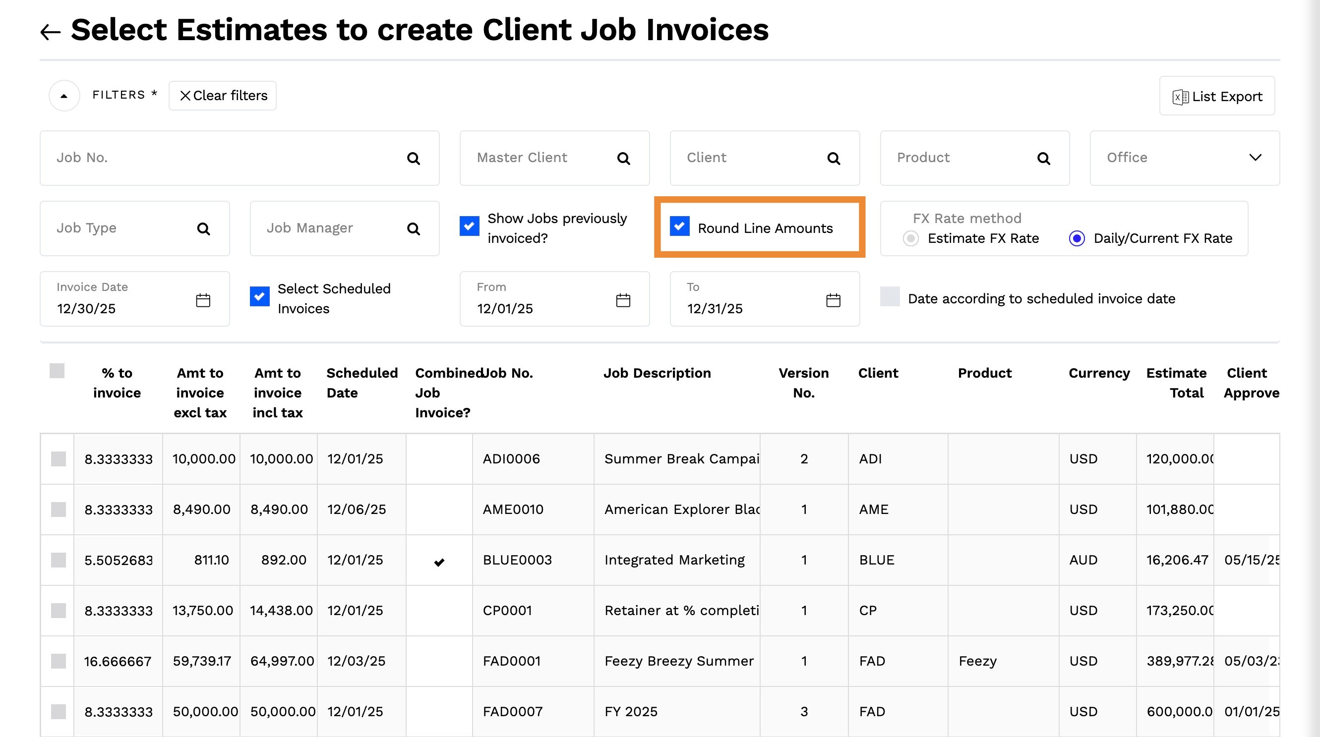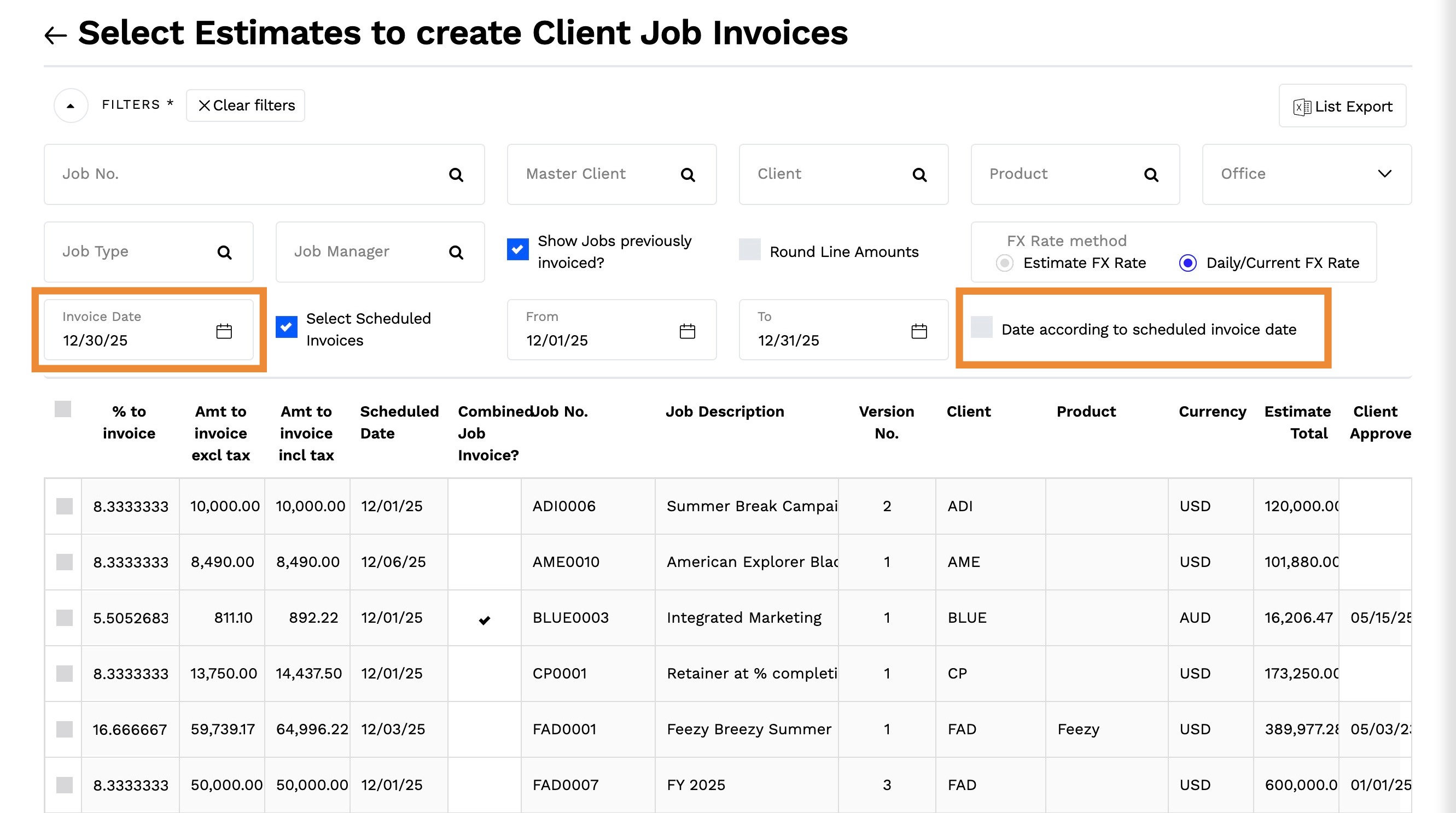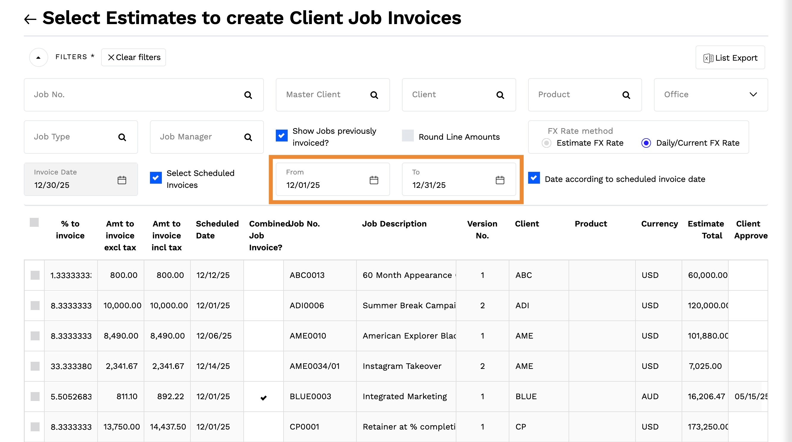 2. By default, this will display all estimates for all jobs which have not been previously invoiced.