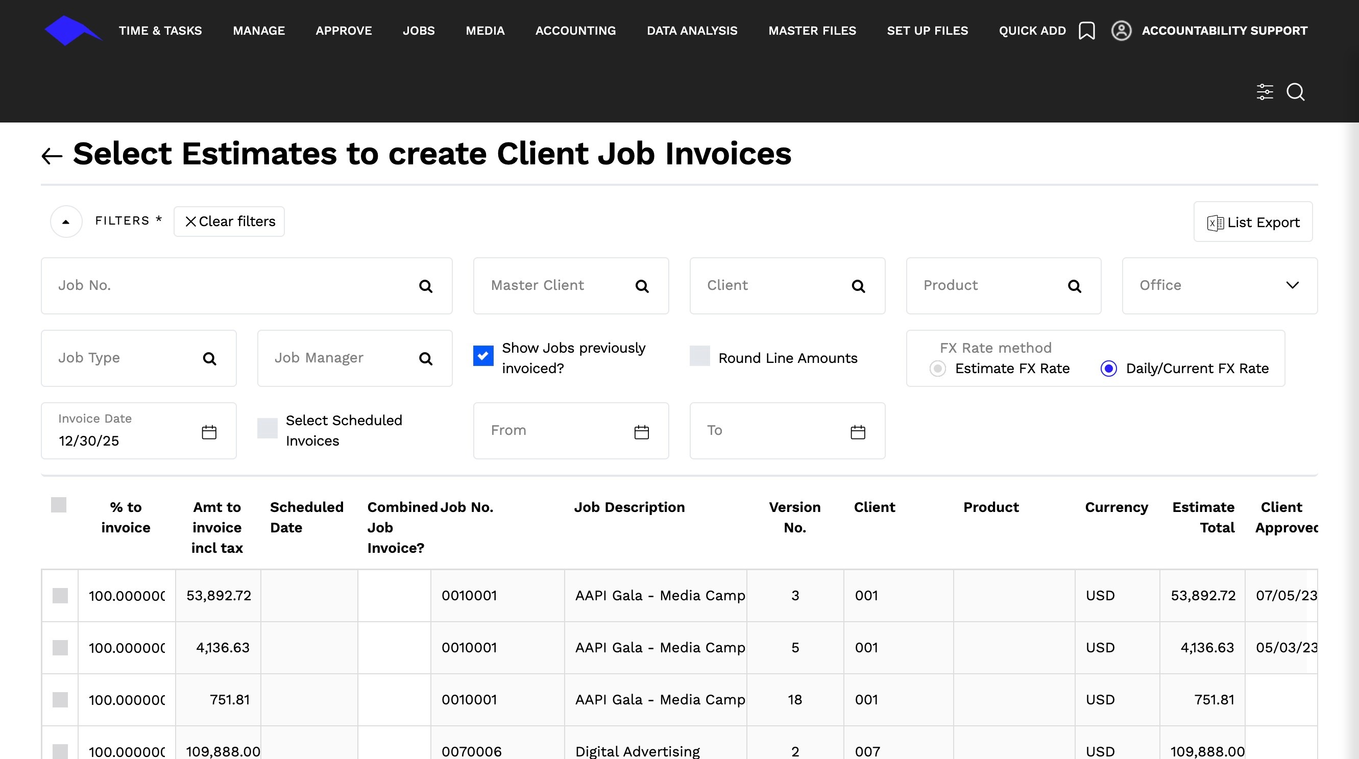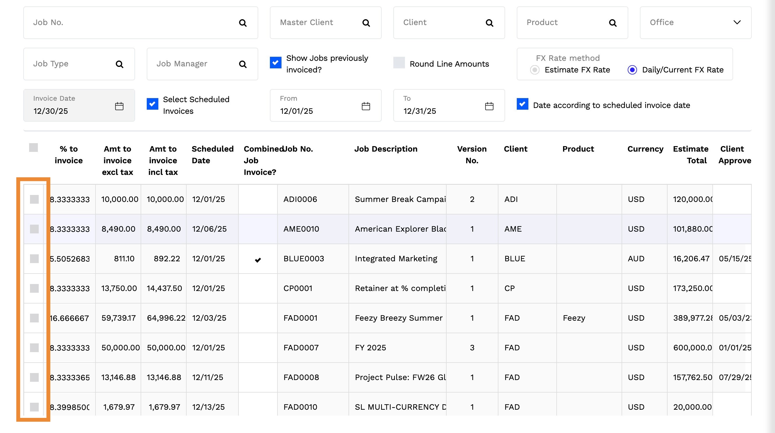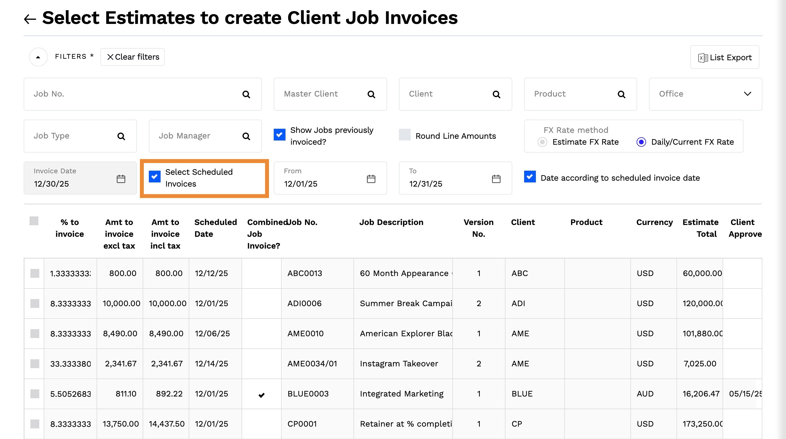 2. By default, this will display all estimates for all jobs which have not been previously invoiced.