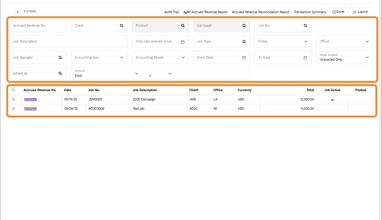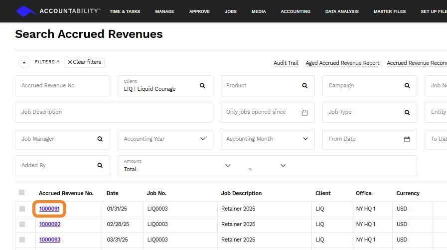2. Use the Filters to narrow down your search, or scroll through the list of Accrued Revenue No.