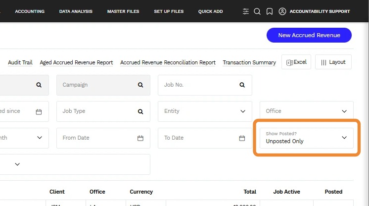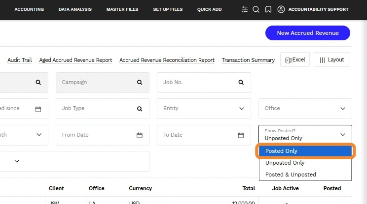 3. By default, the Search Accrued Revenues only displays a listing of Unposted Only transactions.