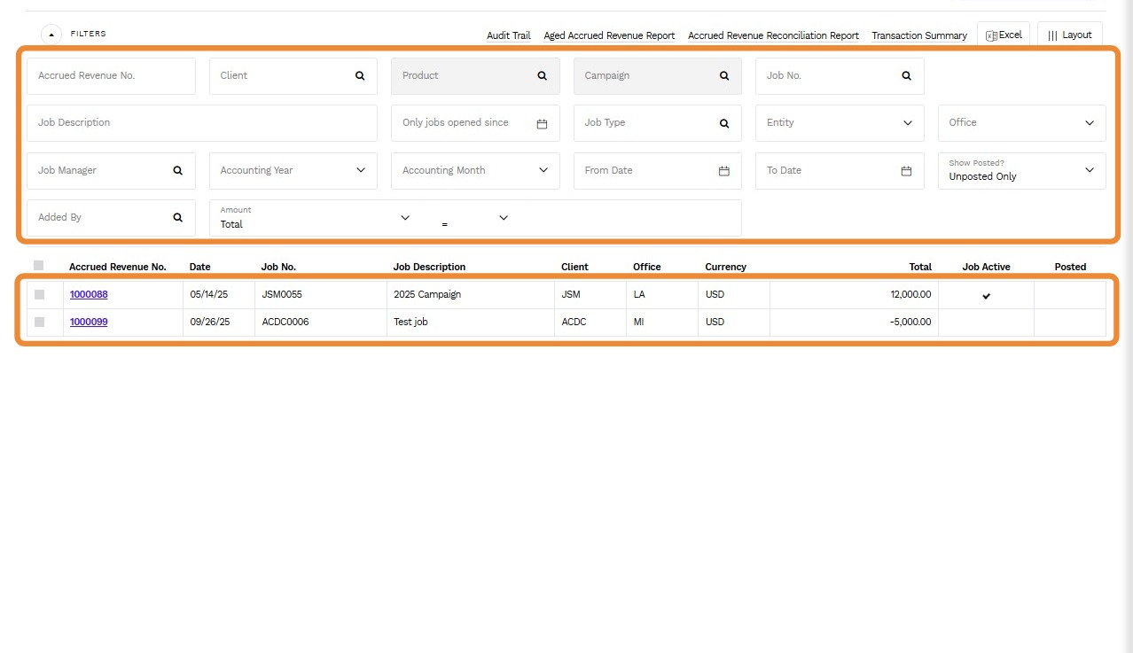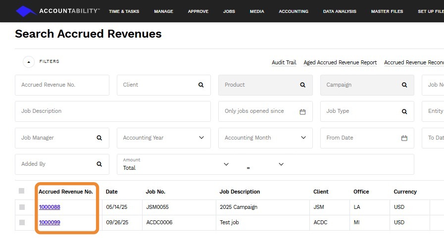 2. Use the Filters to narrow down your search, or scroll through the list of Accrued Revenue No.