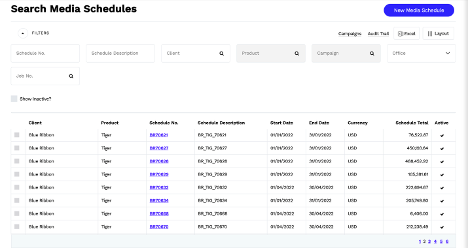 Click into an existing Schedule No. or click "New Media Schedule" to create a new one. Media Schedules can also be created in bulk through the Accountability API or through the standard import template, which can be accessed through the "Excel" link.