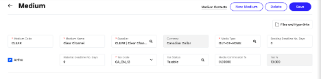 - Currency – This is the default currency for the Medium. The currency can be overridden at the media schedule line item level.