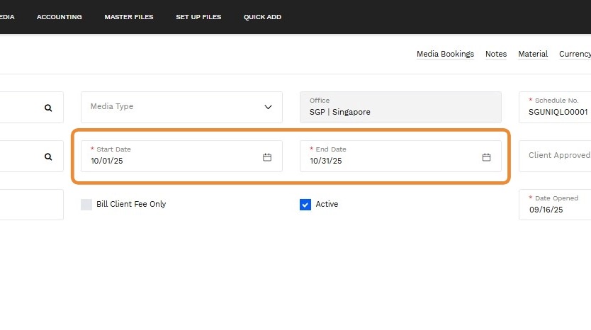 12. Start Date / End Date: The active period for the media schedule. Defines when media will run.