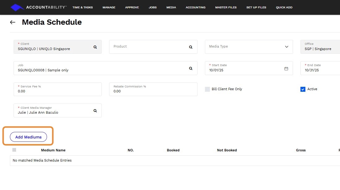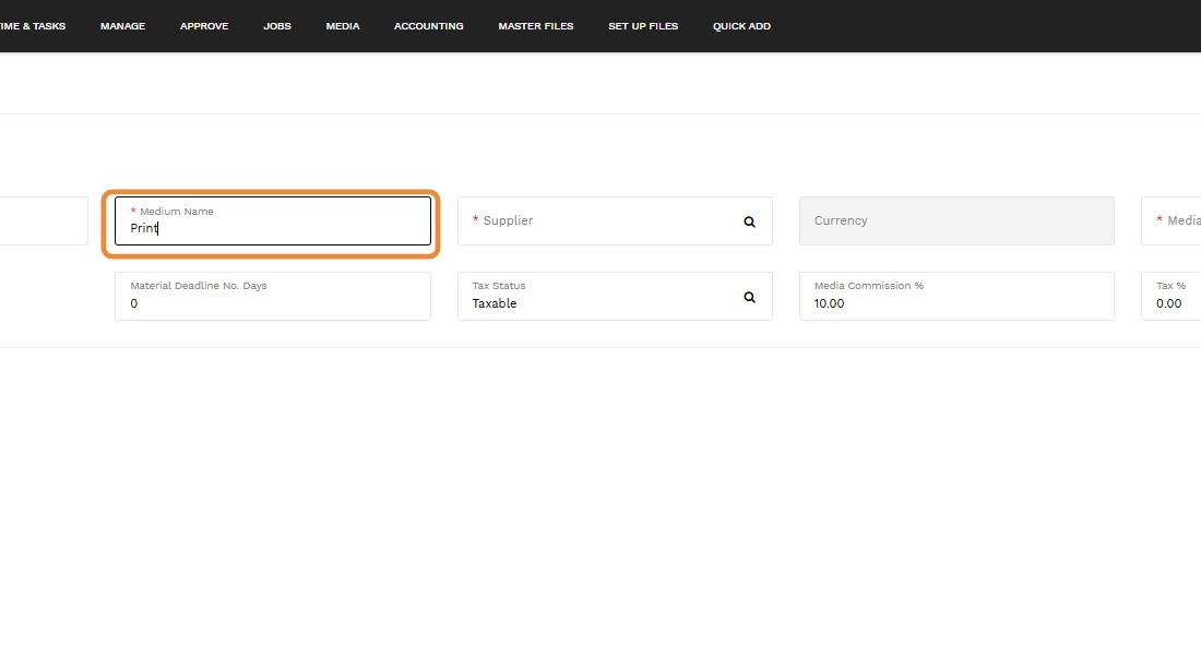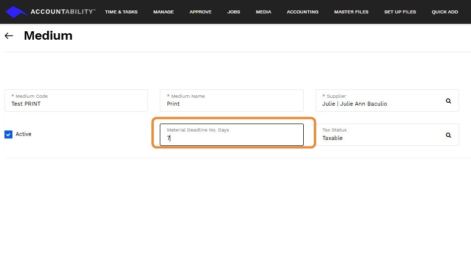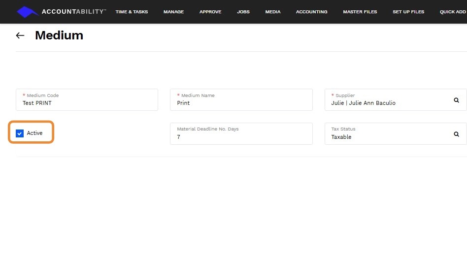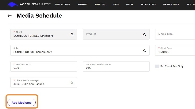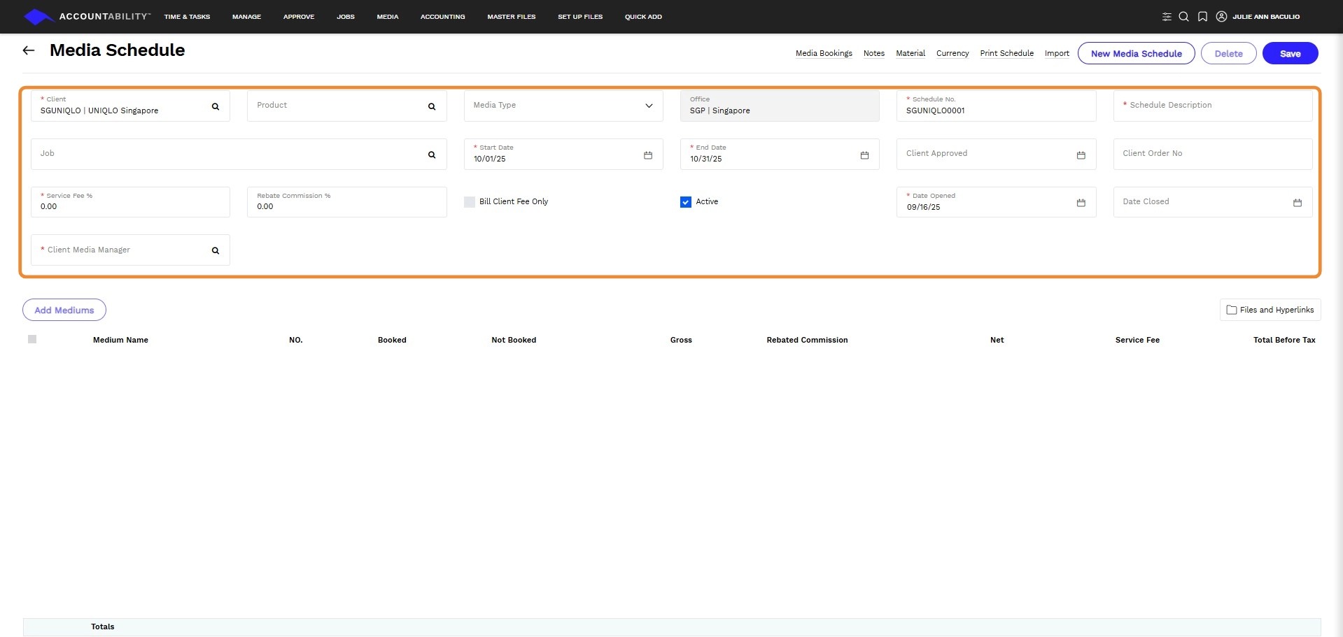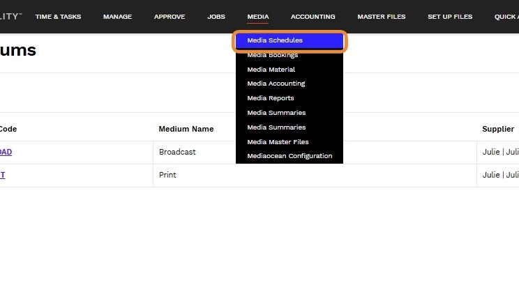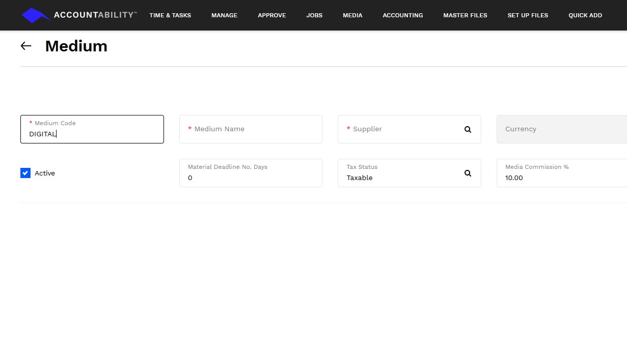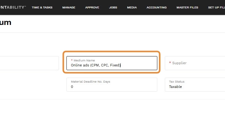 Media types in Accountability define the detail required for schedules. Broadcast, print, and online each have specific rate, placement, and adjustment fields that determine accurate client billing and supplier payments.
