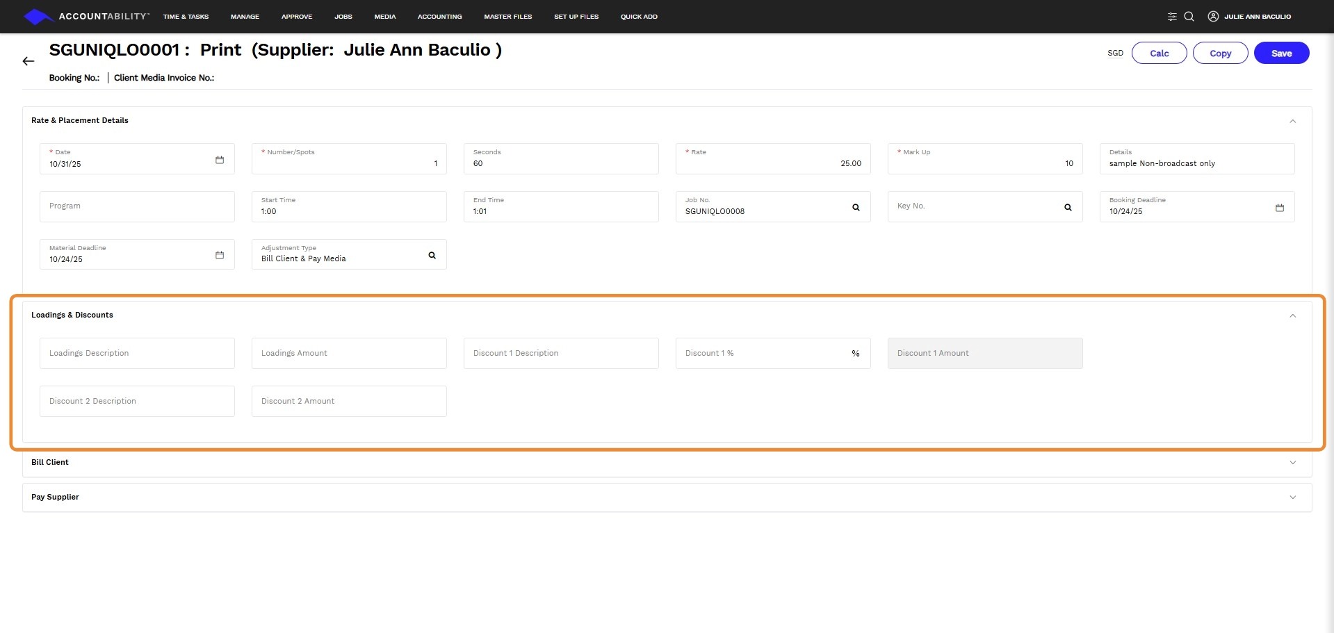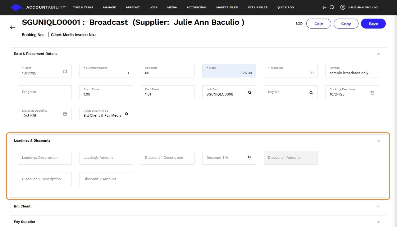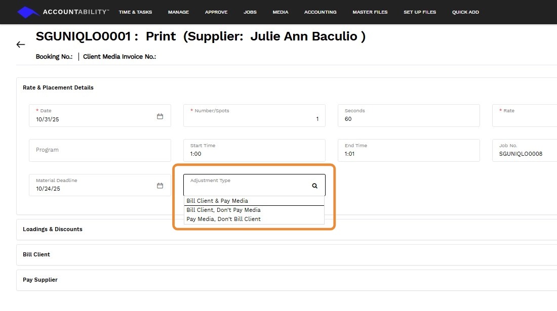 - Bill Client, Don't Pay Media The client is billed, but the supplier is not paid through Accountability. Used when media is client-direct or already paid outside the system.