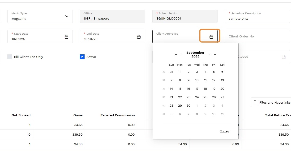 13. Client Approved: A calendar field to record the date the client approved the media schedule. Used for audit and workflow tracking.
