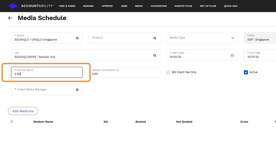 14. Service Fee % : The percentage fee charged to the client for managing the media.