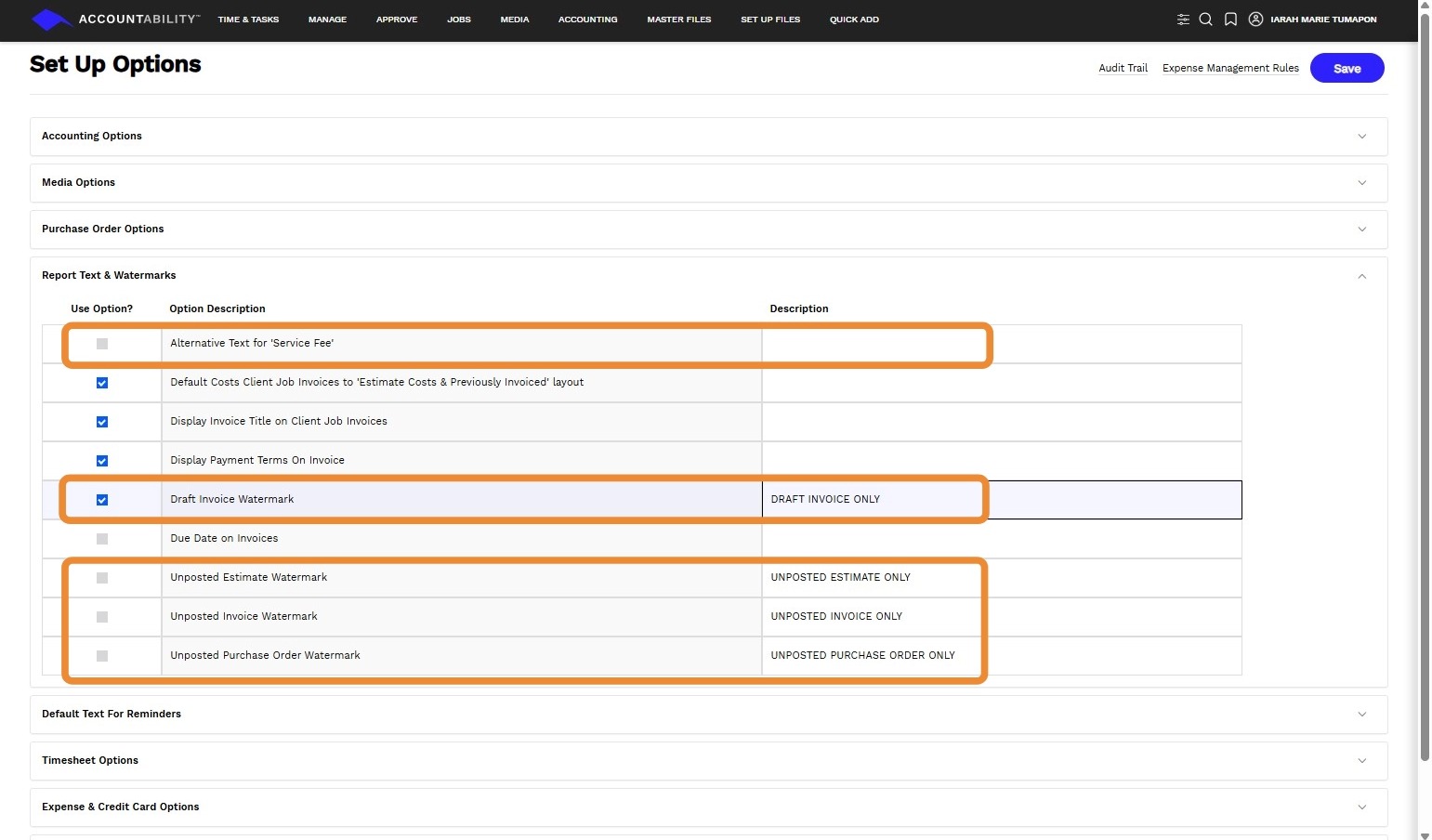 • Unapproved Invoices will display the Watermark text you enter. The default setting is to check